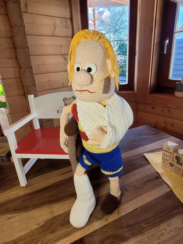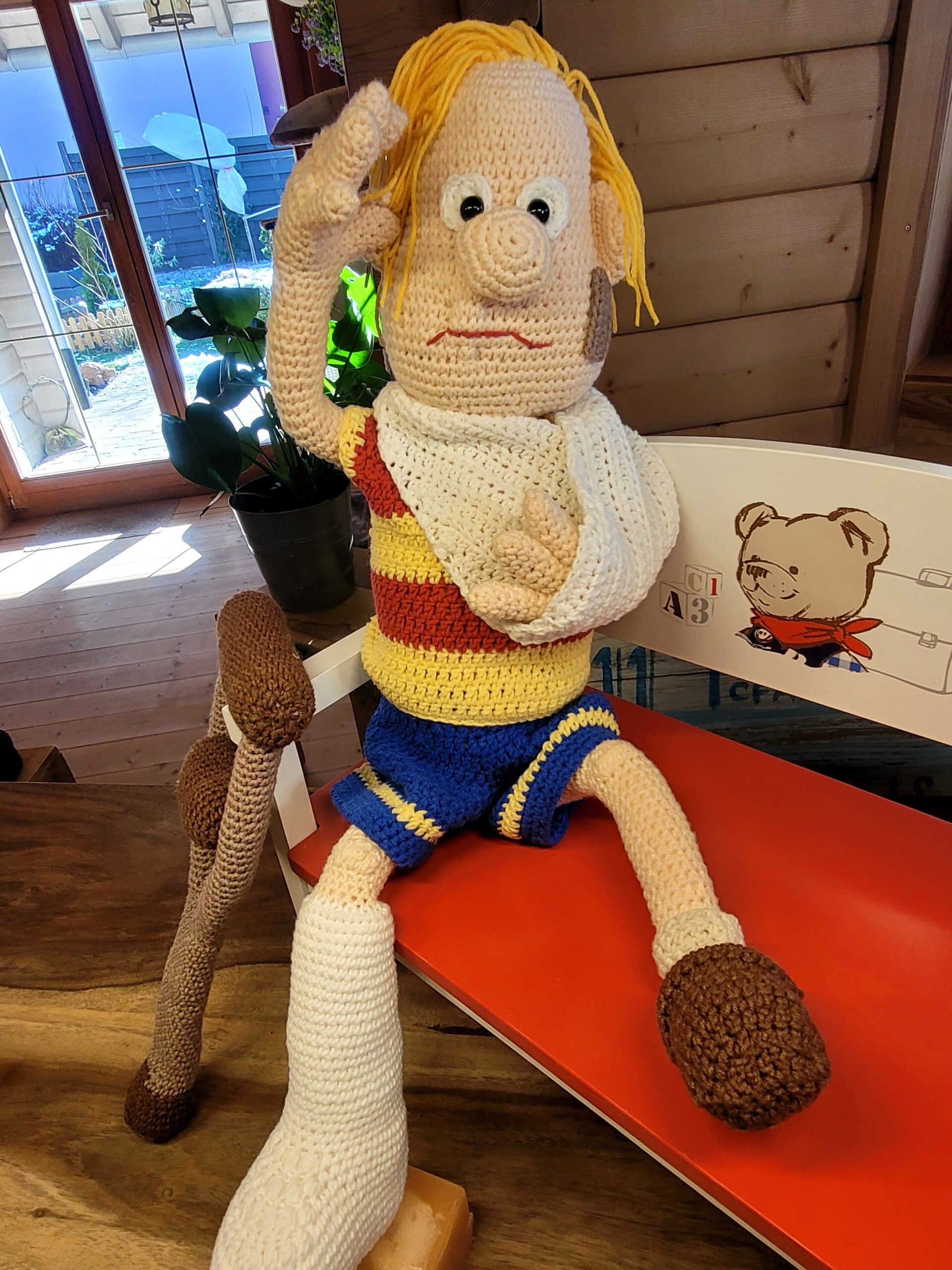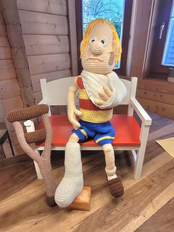 Mit ganz viel Liebe zum Detail wurde der Pechvogel Hannes gehäkelt. Hannes wollte die Zeitung holen und ist gestolpert. Dabei ist er dann auch noch die Treppe herunter gefallen. Jetzt hat er sich das Bein gebrochen. Dazu den Arm verstaucht. Am Kopf auch noch eine Platzwunde. 😪